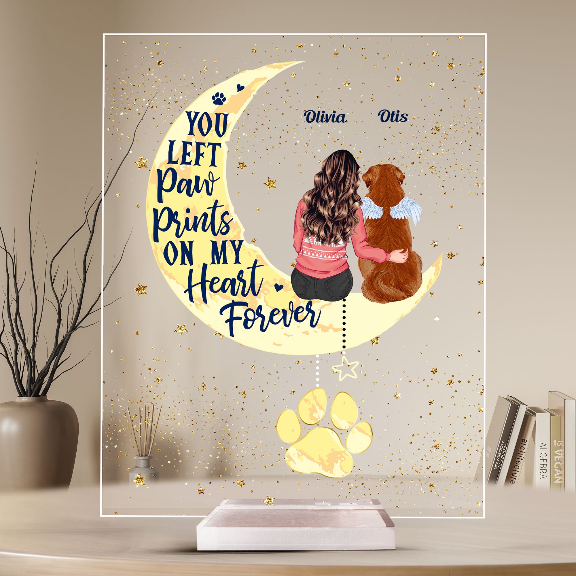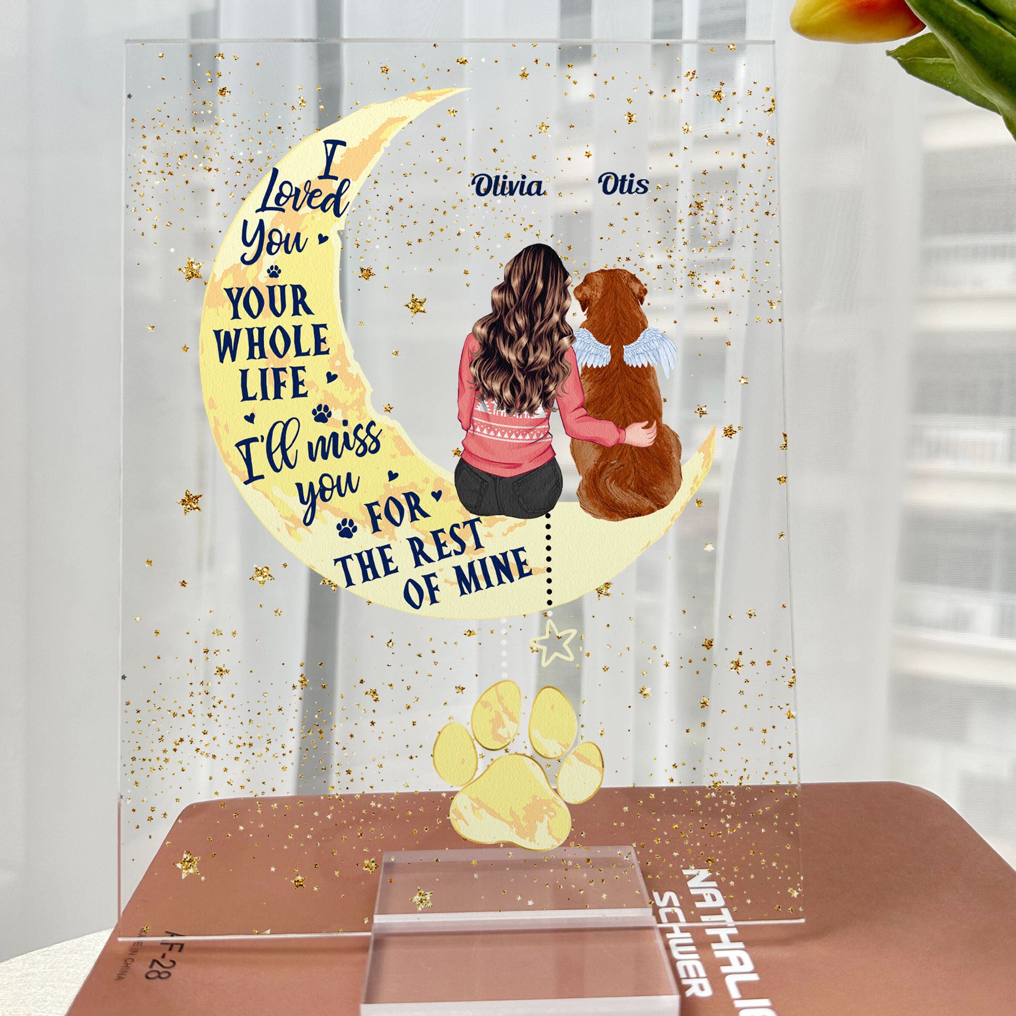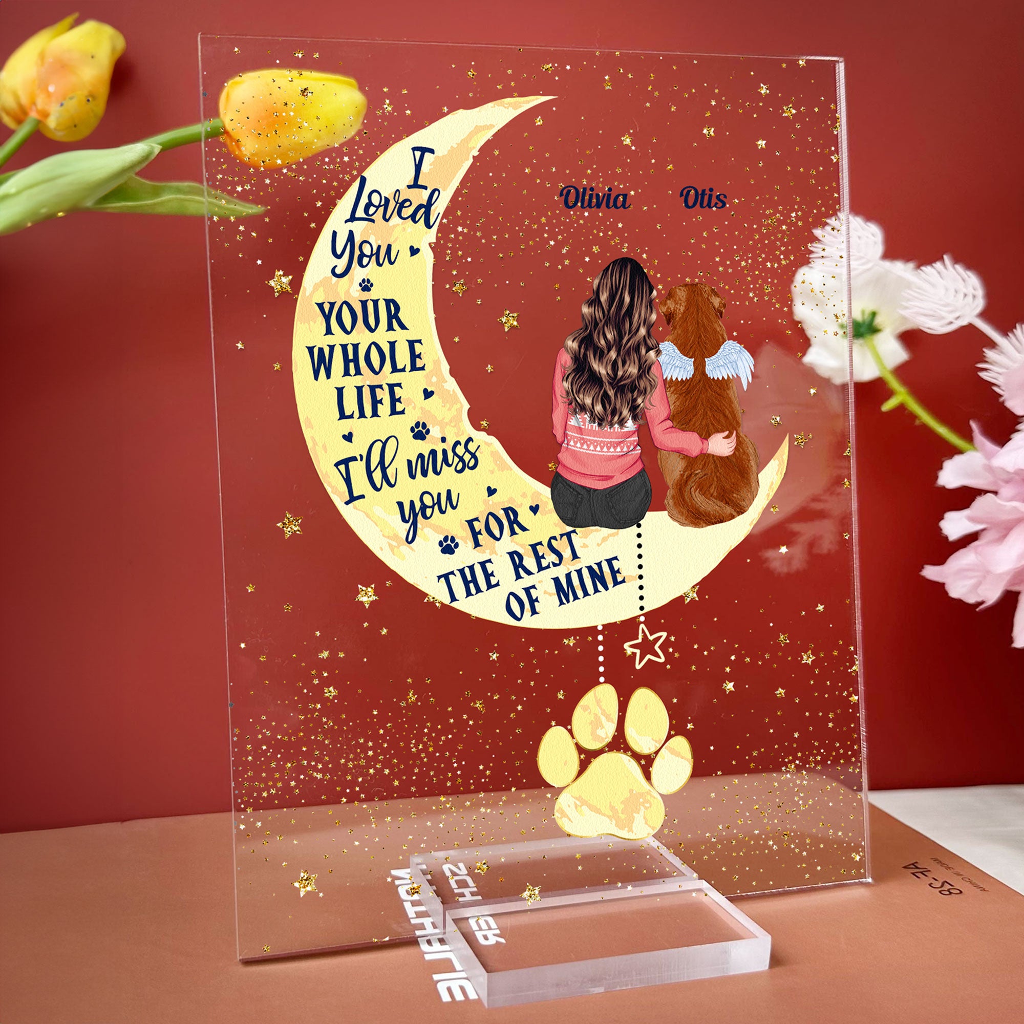 Honor the special bond with your beloved pet with this heartfelt Personalized Pet Memorial Acrylic Plaque. Featuring a touching illustration of a person sitting with their pet on a crescent moon, alongside the heartfelt message, “I loved you your whole life, I’ll miss you for the rest of mine,” this plaque serves as a beautiful keepsake to cherish the memory of your furry friend. Customizable with your name and your pet’s name, it’s the perfect way to keep them close to your heart. Ideal for pet lovers looking for a comforting tribute to their forever companion.